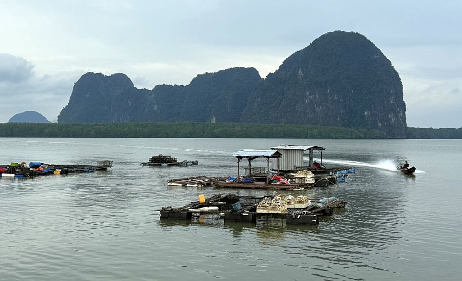 The ones with roofs but open sides are working areas, used for feeding fish, storing equipment, or giving shade to workers. The ones that look more like simple rafts with items on top are often fish pens below the surface, where species like grouper, snapper, or sea bass are raised. Nets hang down into the water beneath them, creating enclosed areas for farming. On the right you can see boat with a motor approaching the rafts ties it all together. These are the everyday working boats of the village used to move between platforms, deliver feed, check nets, and harvest fish. Watching one glide toward the rafts gives you a glimpse into the rhythm of life here: quiet, steady, and closely tied to the water.