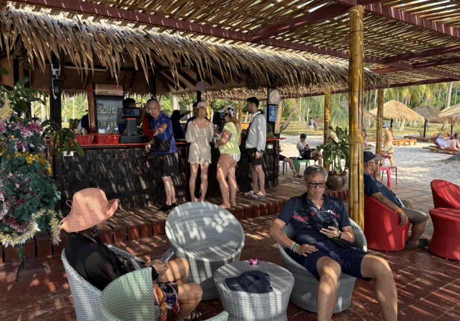 View of the beach from the bar. People sit under the shade, sipping cold drinks, unwinding after the boat rides and walking tours, there’s a gentle buzz of conversation, but it never feels crowded or rushed.