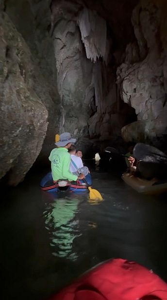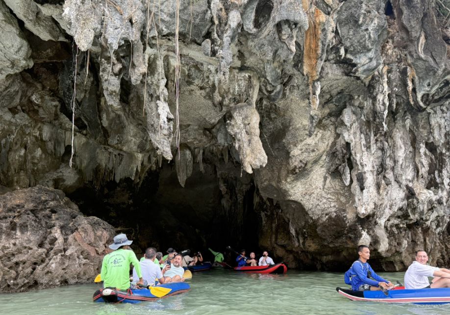 Above the entrance, clusters of stalactites hung down like jagged teeth, their tips darkened by moisture and time. There was a quiet rhythm to the scene, canoes slipping in and out in an orderly flow, each one waiting its turn to pass through the narrow opening.