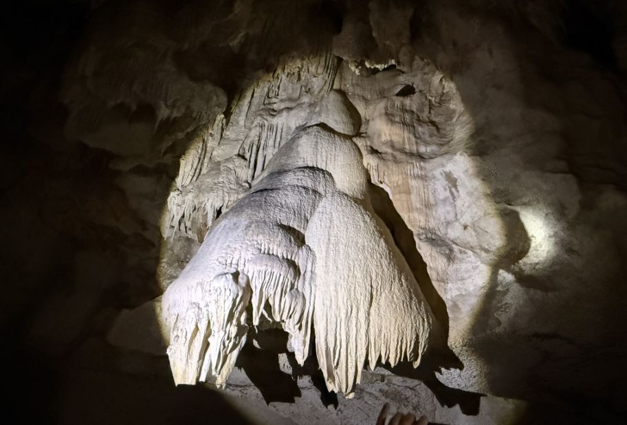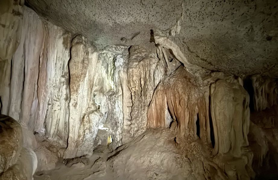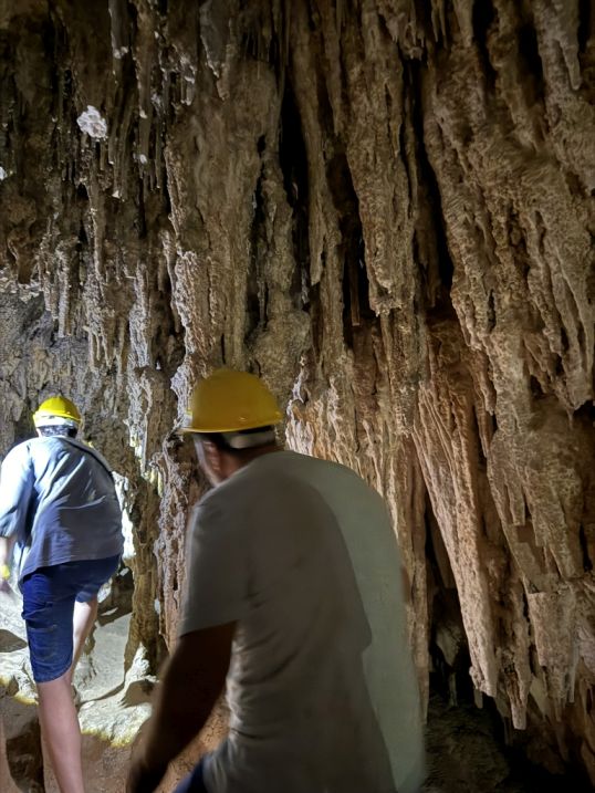As we continued deeper, the cave narrowed in places, forcing people to slow down and follow the winding path more carefully. These tighter corridors made the experience more intimate, almost tunnel-like, with the rock formations pressing in closer. Here, the details became even more striking, rippling mineral deposits clung to the walls, resembling flowing curtains or melted wax. Some surfaces shimmered slightly under the dim lighting, reflecting moisture that constantly seeped through the limestone. The muddy ground beneath your feet told the story of the tides, showing how the sea periodically reclaims this space.