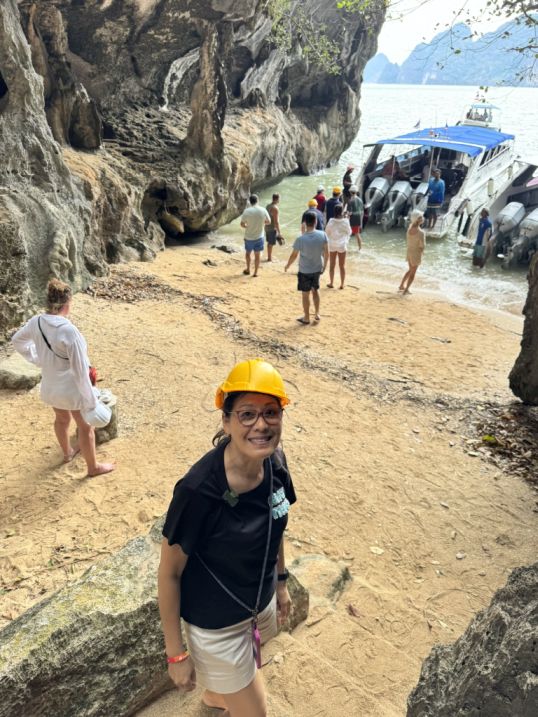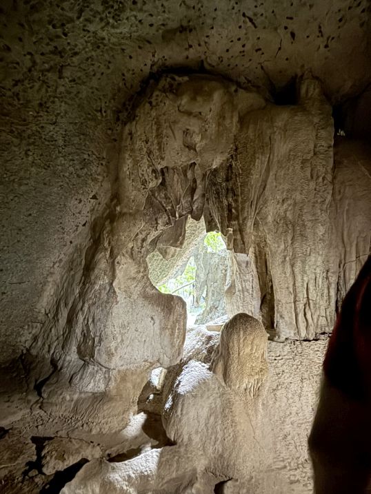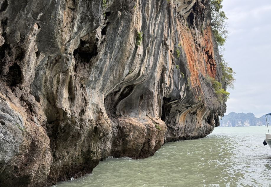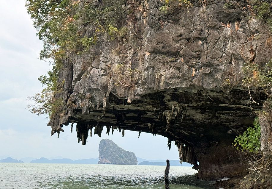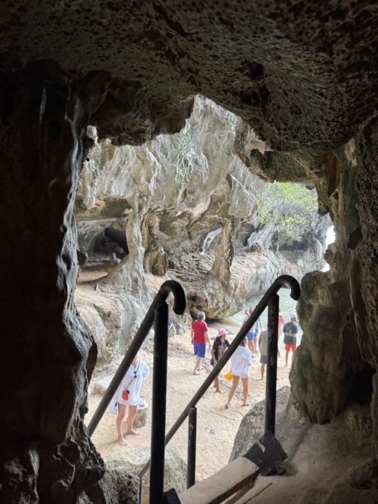 The transition was striking: from dim, enclosed darkness to a framed burst of daylight. Looking out, we could see the calm waters of Phang Nga Bay and the towering limestone cliffs beyond, almost like the cave itself was a window carved into the island.