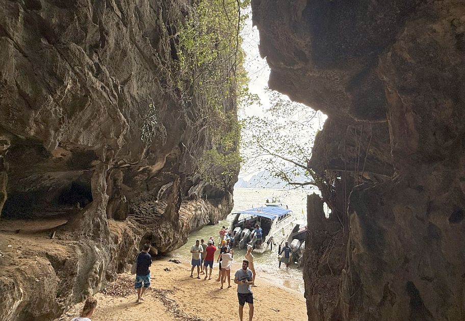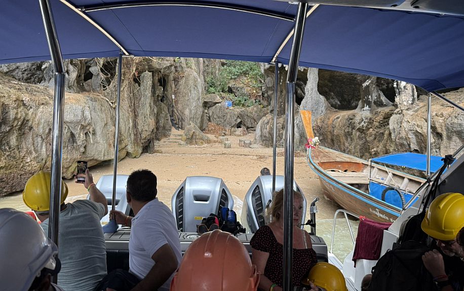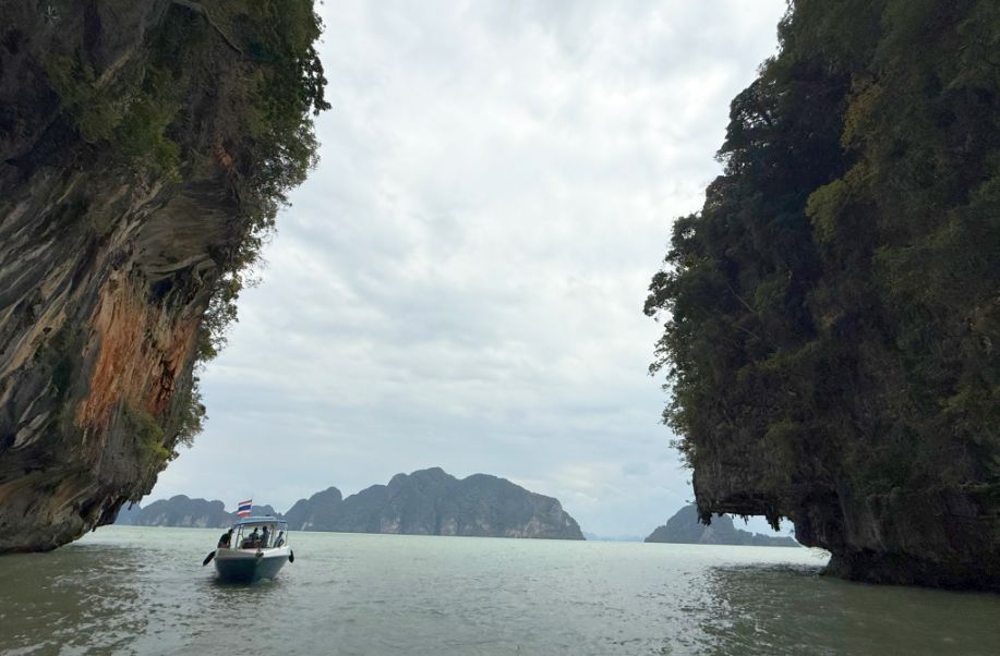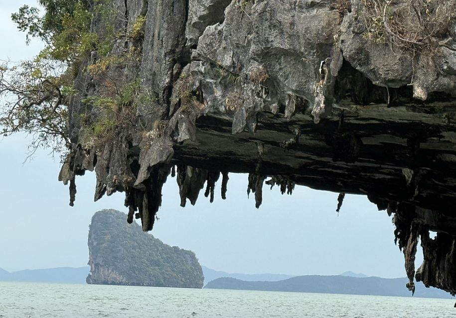 From the upper part of the cave, the view opened like a natural balcony onto Phang Nga Bay. Framed by the jagged mouth of the cavern, where we could see where our boat was waiting, floating quietly against a backdrop of towering limestone walls.