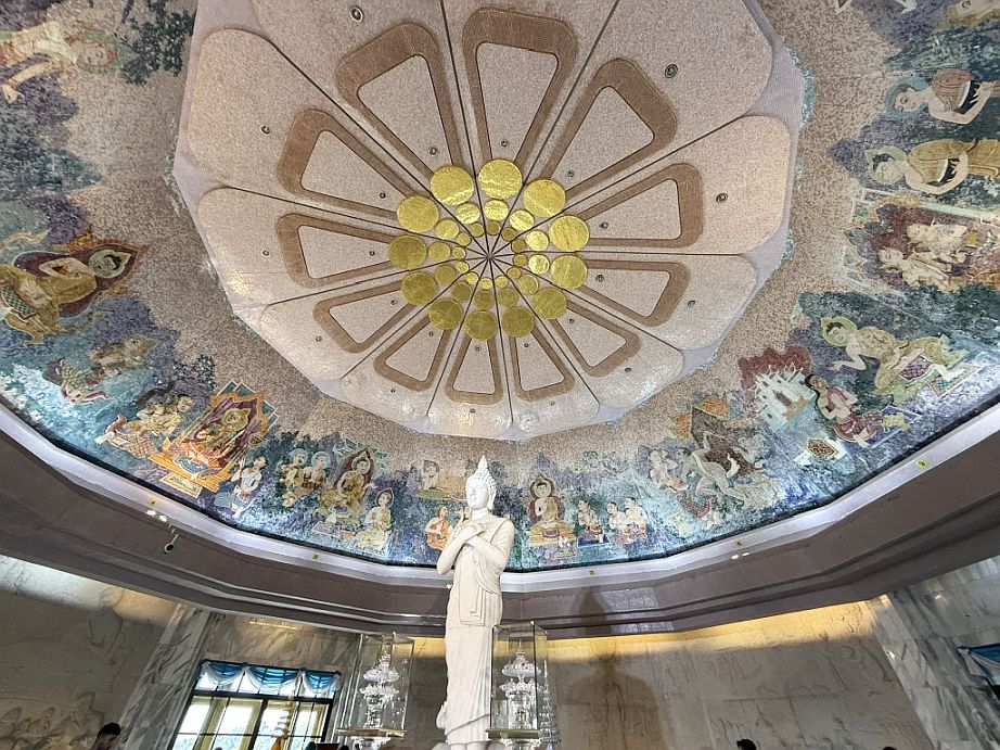 The ceiling is painted in rich, deep tones with celestial motifs with soft gold accents against darker backgrounds. The effect is meant to evoke the Buddhist cosmos, drawing your attention upward toward enlightenment.