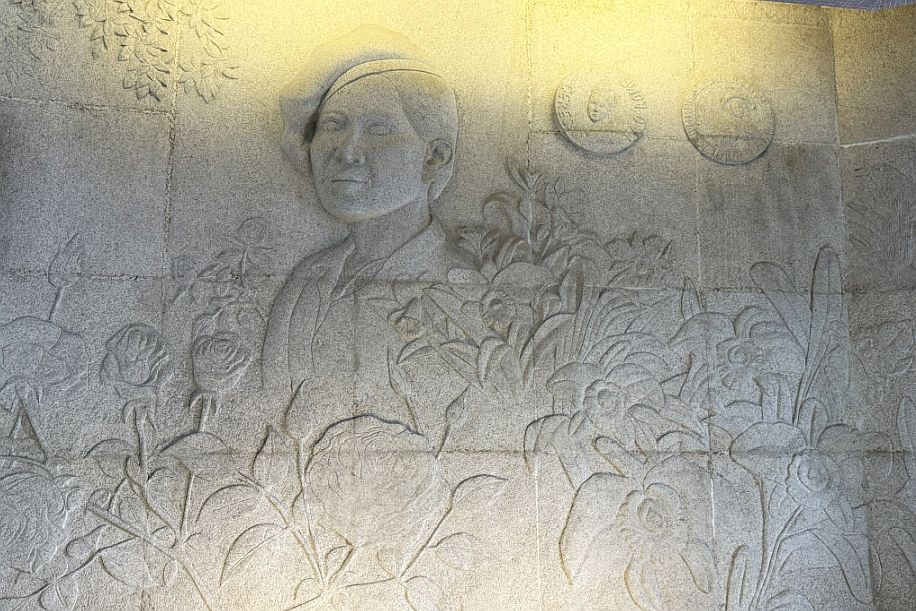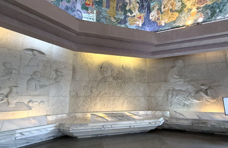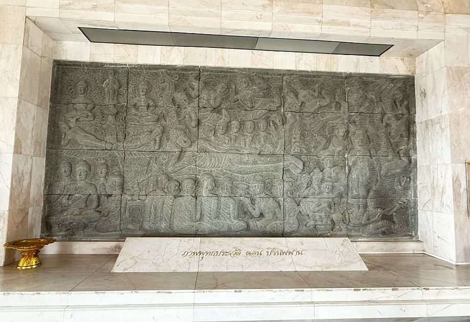 This panel tells the story of Princess Yashodhara. She was the wife of Prince Siddhartha (who later became the Buddha). Her story represents devotion and spiritual determination: After the Buddha began teaching, she sought to follow his path, she asked to be ordained. Once accepted, she became one of the early bhikkhunis (female monks).