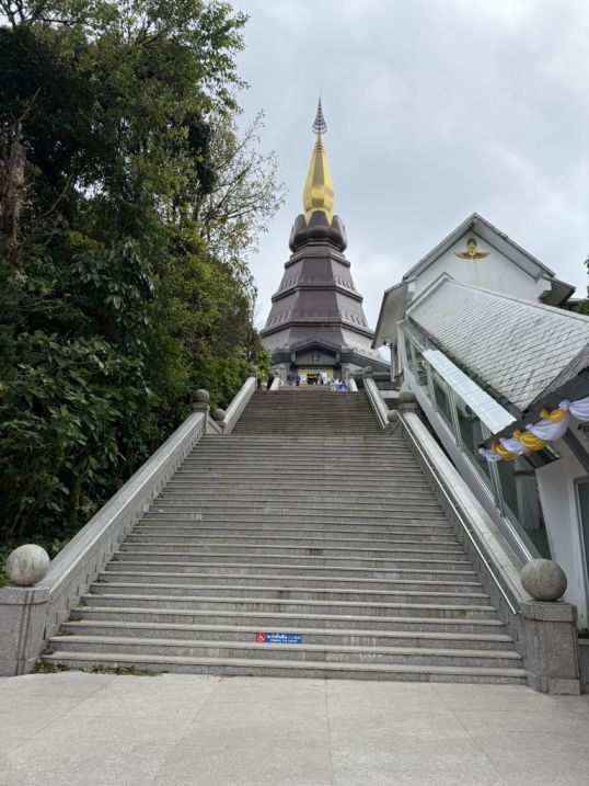 Climbing the stairs to get to the King's pagoda: Phra Mahathat Naphamethanidon which was completed in 1989.