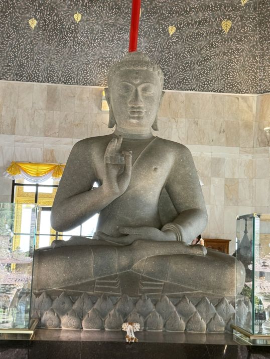 At the center sits a seated Buddha, grounded and serene. It is a meditative posture, inviting quiet reflection rather than drawing attention upward. There’s a sense of stillness here that contrasts with the more ceremonial feel of the King’s tower.
