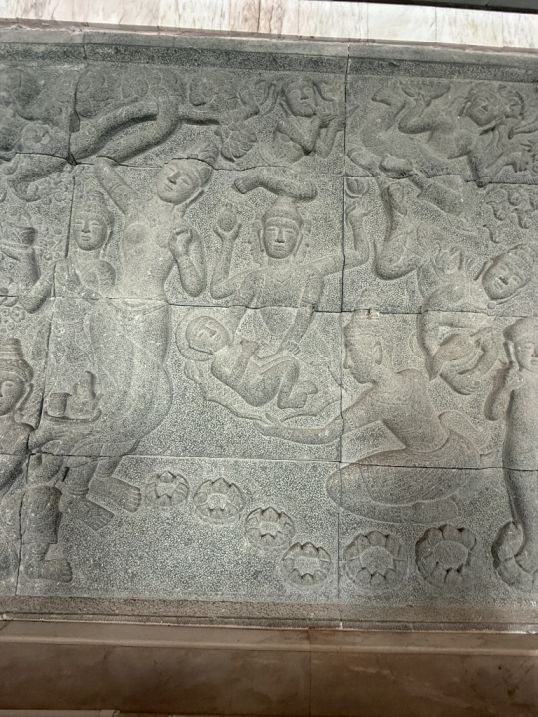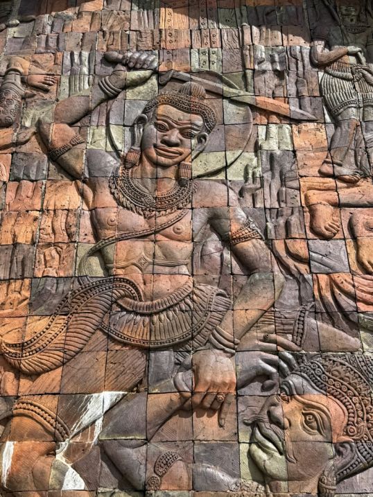 One of the most striking was a decorative panel in a warm orange tone. Up close, we could see it was composed of many small square pieces, like tiles or carved segments carefully assembled to form a larger image. The figure we saw, resembling a warrior holding a sword while gripping another person’s arm, likely represents a guardian or protective figure. In Buddhist and Thai temple art, these figures are not just decorative, they symbolize the protection of sacred spaces, the triumph of good over evil, or the discipline needed to overcome inner struggles.