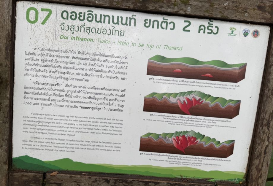 This panel about the land being “lifted” refers to tectonic activity. Over millions of years, movements of the Earth’s crust gradually pushed this area upward, forming the mountains of northern Thailand. It’s a reminder that what feels still and ancient is actually the result of slow, powerful geological change.