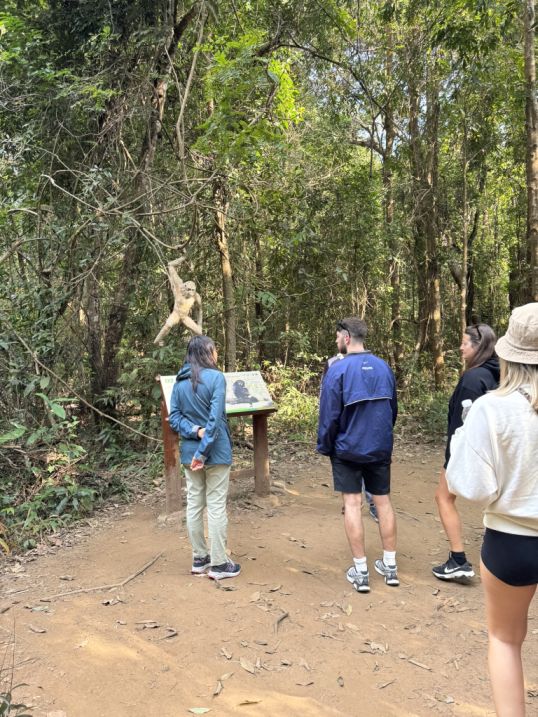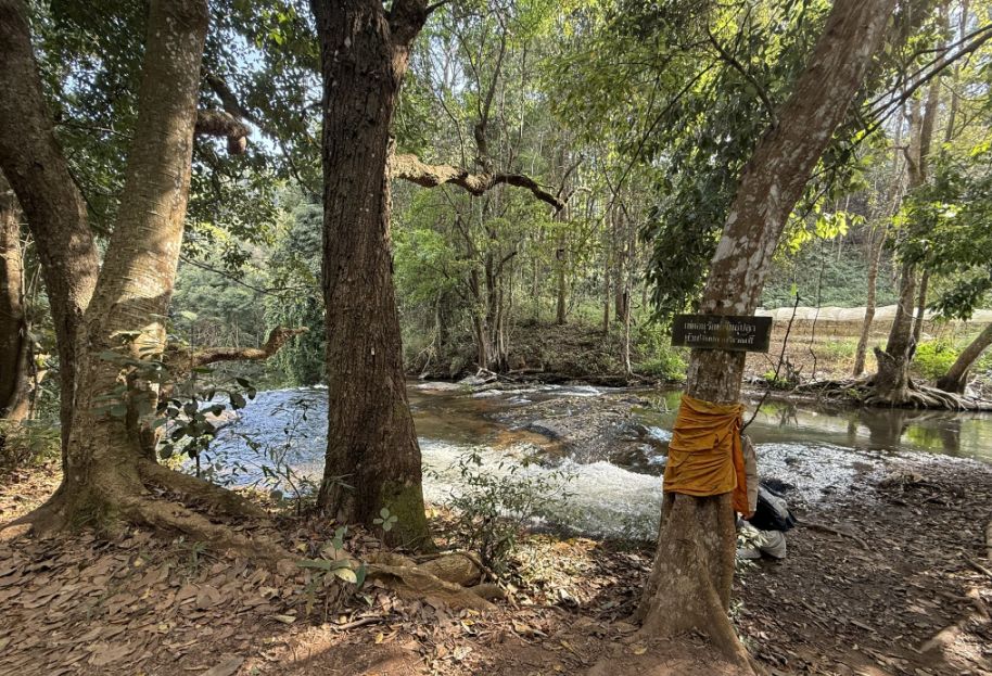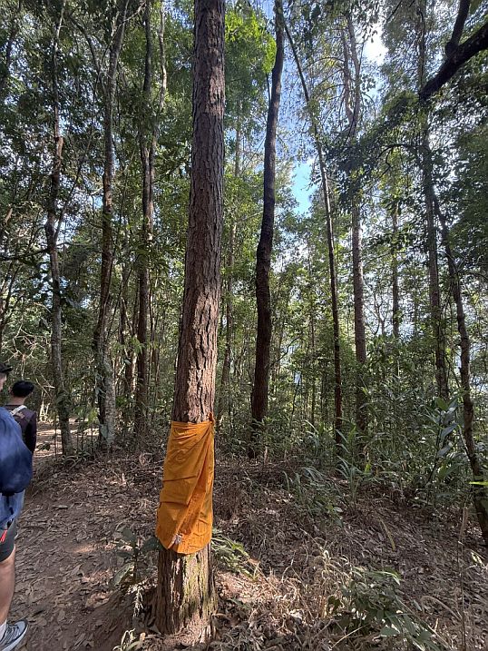 As we continued, we noticed again those trees wrapped in bright orange cloth, similar to a monk’s robe. These are known as “ordained trees.” In Thai Buddhist tradition, monks symbolically wrap trees in saffron cloth to mark them as sacred. Once “ordained,” they are protected, people will not cut them down. It’s a powerful example of how spiritual belief is used to protect the forest.