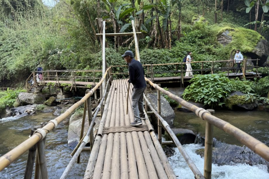 Crossing a simple bridge made with bamboo.