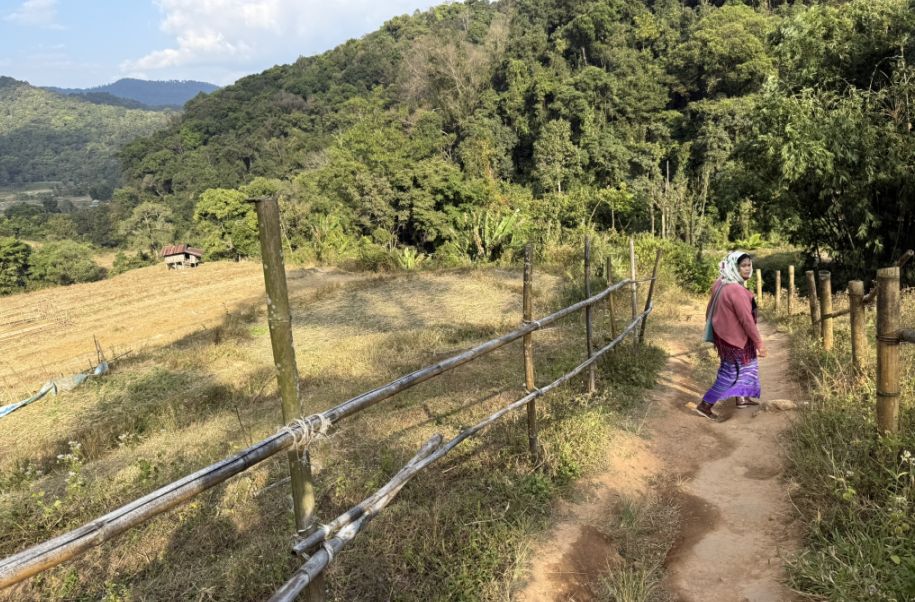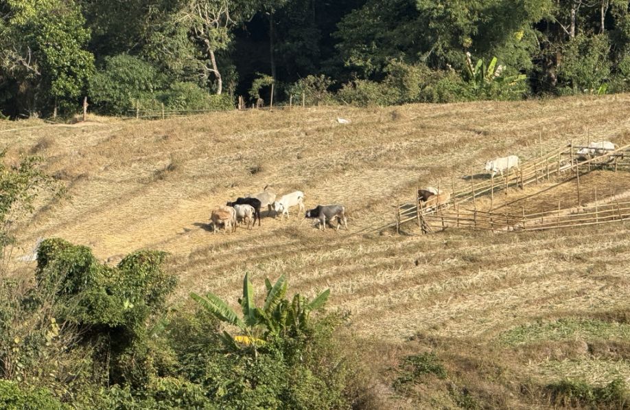 As we continued along the trail, the landscape began to open up again, and we found yourself on a slightly elevated, hilly walkway, an indication that you were getting close to the village of Ban Mae Klang Luang.