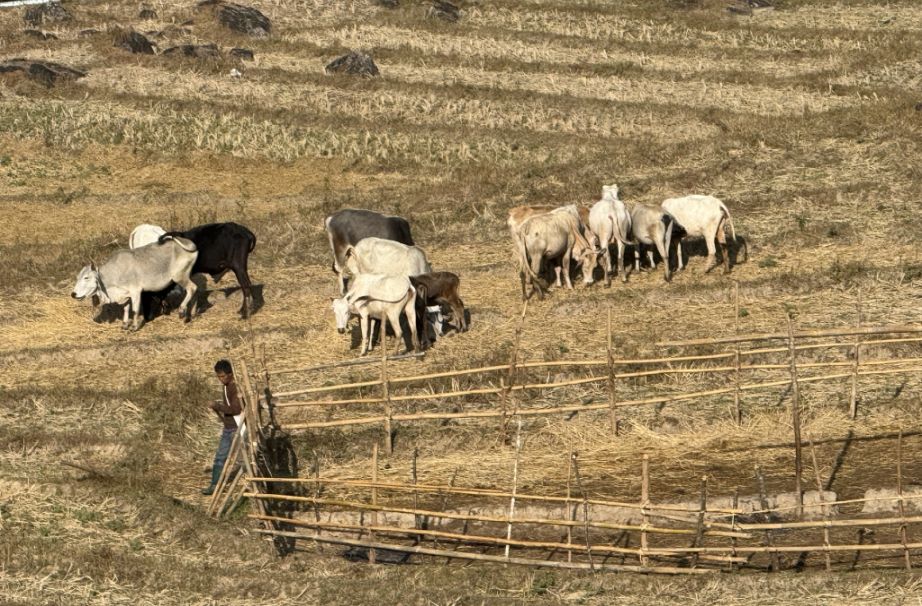 Below we can see signs of daily life with cows roaming freely, small enclosures, and a few simple wooden shacks topped with red metal roofs, scattered across the landscape.