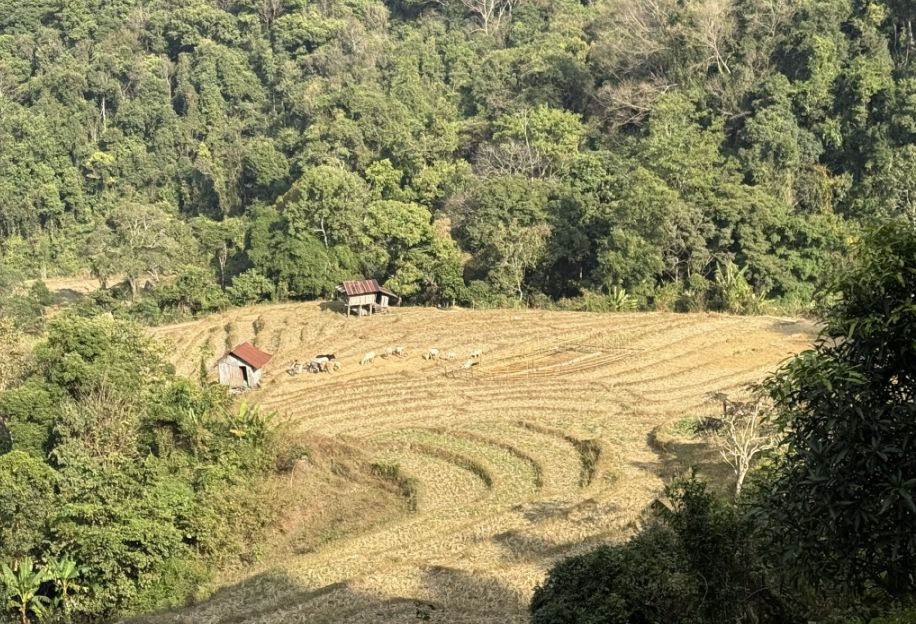 From this vantage point, the view stretched out below you, and we could see terraced rice fields carved into the hillside, their layered patterns following the natural contours of the land. Beyond the fields, the mountains rose in the distance, wrapped in forest, creating a sense of depth and quiet isolation.