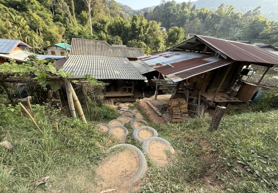 The metal roofs are more modern additions, practical, durable, and easier to maintain than traditional thatch, especially with changing weather patterns. What makes this village special is that it’s home to the Karen hill tribe, a community that has lived in these mountains for generations. Today, their way of life blends tradition with adaptation. Notice how they used old tires filled with dirt to a makeshift steps as a safer way to move up and down in rainy conditions. It’s simple, resourceful, and effective, nothing goes to waste