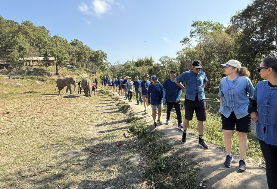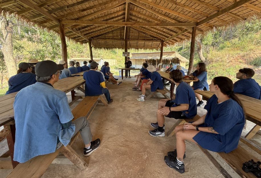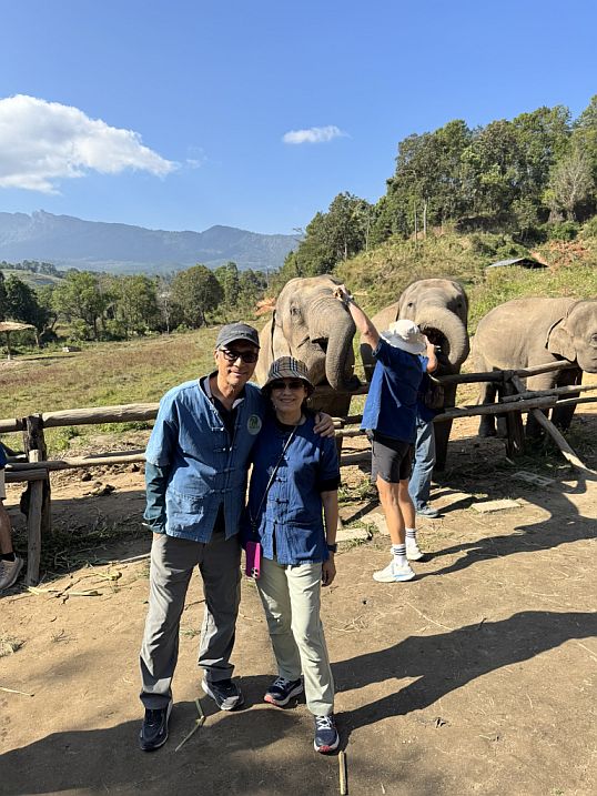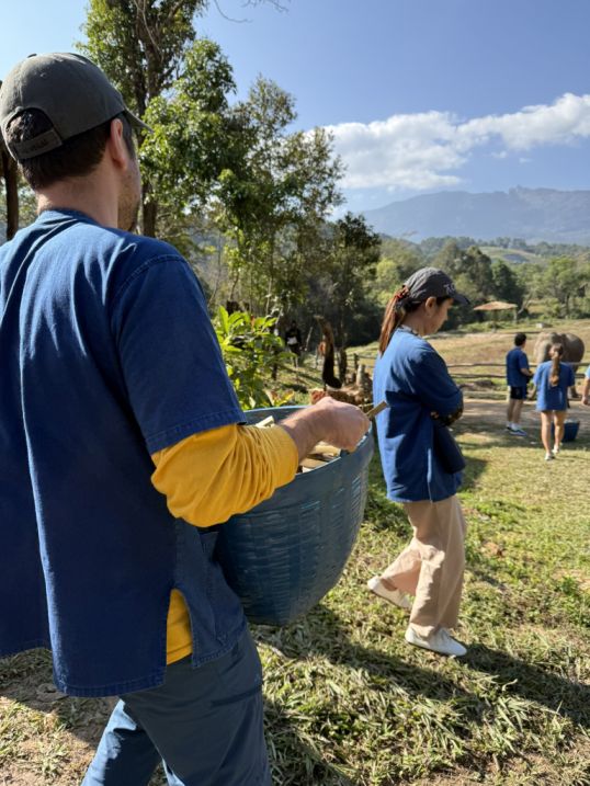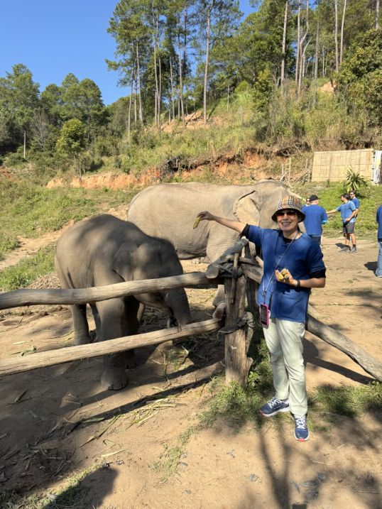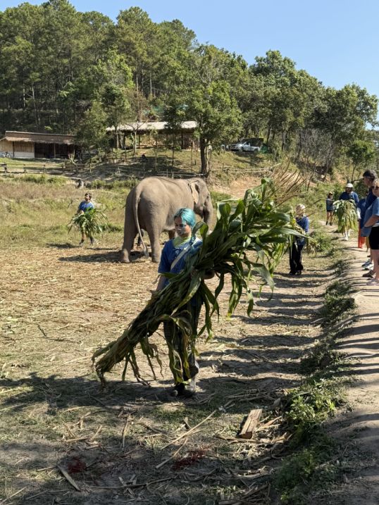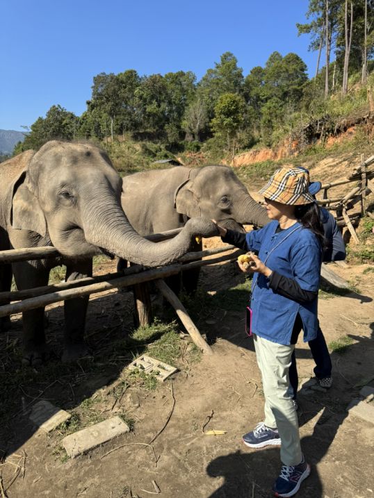 Our tour guide gave us a blue shirt, and we all put on a simple “mahout-style” clothing (like a blue jacket) to create a sense of immersion. Our tour guide explaining how they take care about the elephants and history before letting us interact with the elephants. He also explained that “Ethical” elephant tourism has become a major shift in Thailand over the past decade. For many years, elephants were used in logging and later in tourism, especially for rides, performances, and entertainment. However, growing awareness of animal welfare has changed traveler expectations, and many travelers began avoiding riding camps, which is why our guide mentioned that the business is no longer viable. Sanctuaries like one emerged as an alternative livelihood for retraining camps into rescue and care centers.