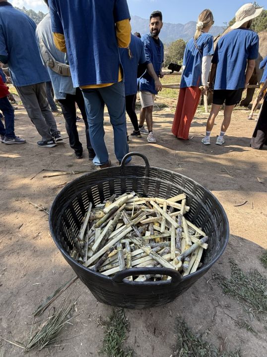 Nearby, our guide organized the group and asked for a few volunteers to help carry baskets filled with cut sugar cane. Each piece had been trimmed into long sticks, easy to hold and offer.
