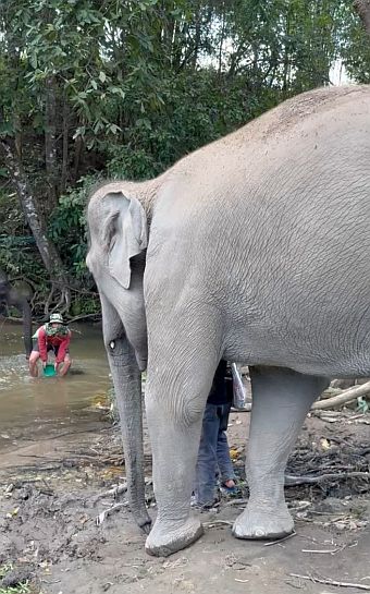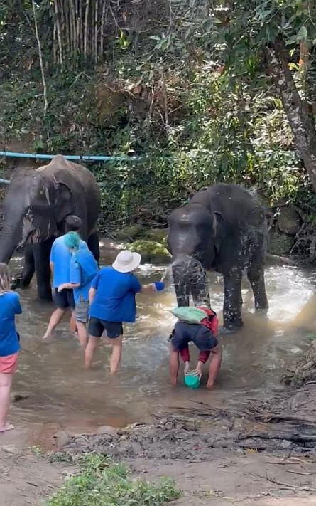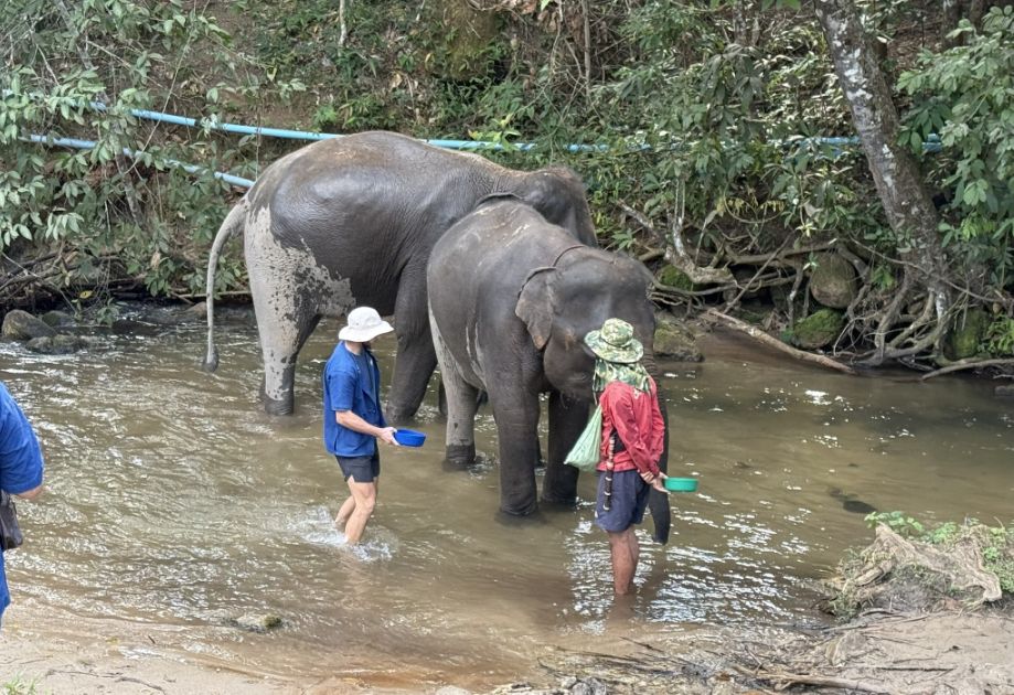 The elephants stood there, soaking it in, sometimes still, sometimes shifting slightly, while water glistened across their bodies. It felt playful, almost childlike, yet grounded in something more meaningful: a shared moment between people and animals, simple and unhurried, set in the natural surroundings of the creek.