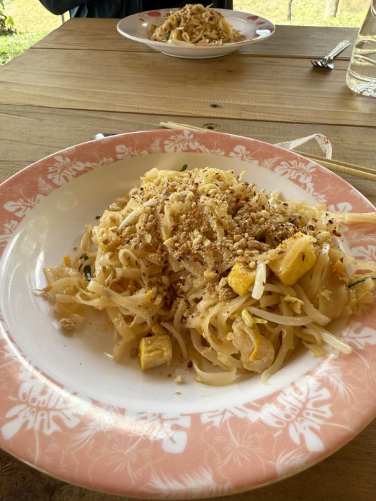 Right there, in the open-air kitchen, they cooked pad Thai fresh on the spot. You could hear the sizzling from the pan, smell the sweet and savory aroma as it drifted through the space, and watch the whole process unfold. It added another layer to the experience, simple, local, and shared together after the morning’s activities. Sitting there, eating, reflecting on what you had just experienced, it really did feel like a special visit.