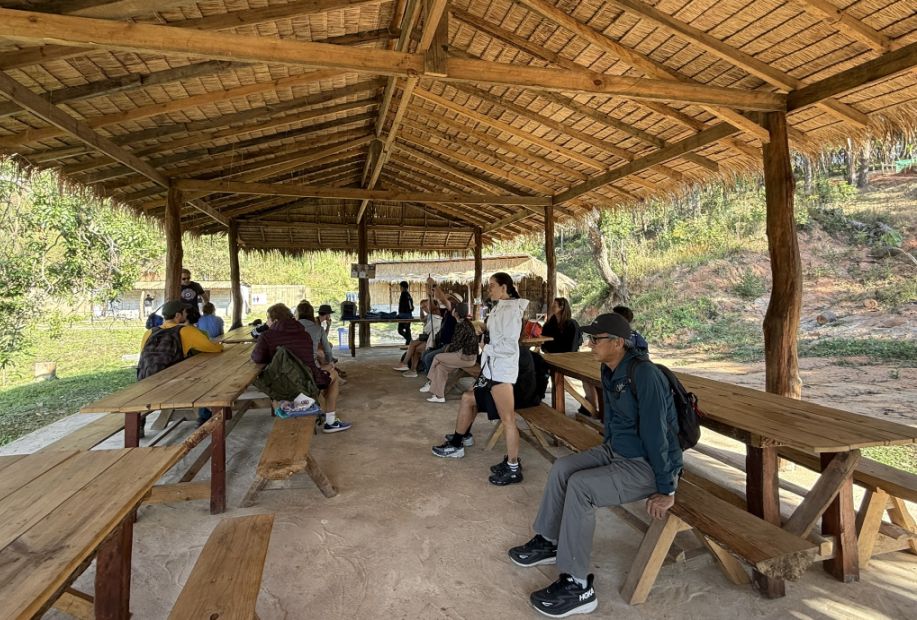 Back at the pavilion, the atmosphere shifted to something warm and communal. Everyone took their seats on the wooden benches while, just a few steps away, the staff began preparing lunch. It was impressive to realize that everything had come with you on the same bus, ingredients, cooking equipment, everything needed to feed the group.