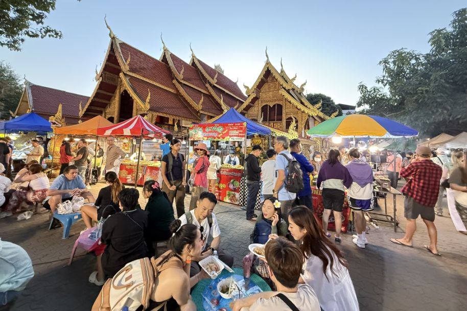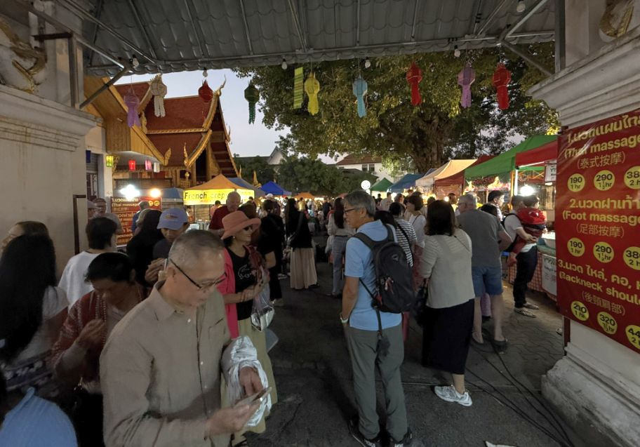 On Sunday evenings, the entire stretch of Ratchadamnoen Road and the surrounding lanes inside the old city walls transforms into a massive pedestrian market, and the sheer number of people and food vendors can feel almost overwhelming but in the best way.