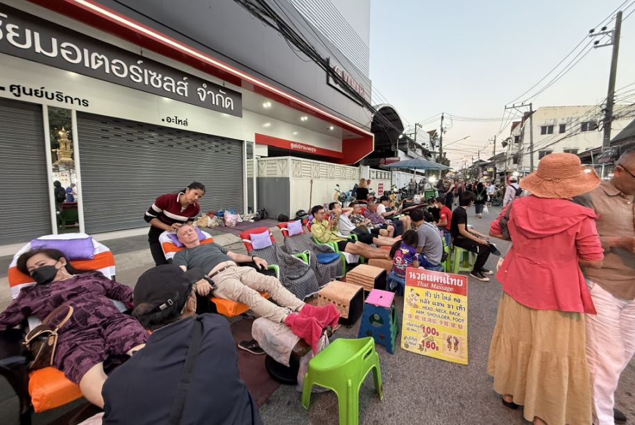 It can feel almost surreal at first, but this is a deeply rooted part of everyday Thai life. Street-side massage is affordable, accessible, and trusted, with many therapists trained in traditional Thai techniques passed down through generations. This panel is listing a price of 100 baht for a basic foot massage and 160 baht for a more complete service (roughly to about $3 to $4.50 USD)