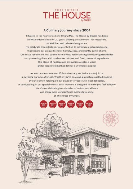 The restaurant has been around since 2004, evolving from a design-focused concept into one of Chiang Mai’s most well-known dining destinations. It is especially known for modern interpretations of Northern Thai cuisine, blending tradition with contemporary presentation. High-quality ingredients, including produce from its own Ginger Farm. As for recognition, The House by Ginger has been consistently featured in the Michelin Guide and has held a Bib Gourmand distinction for several consecutive years (since around 2020 to the present). This award highlights restaurants that offer excellent food at good value, which aligns perfectly with its reputation—refined yet approachable dining rather than formal fine dining.
