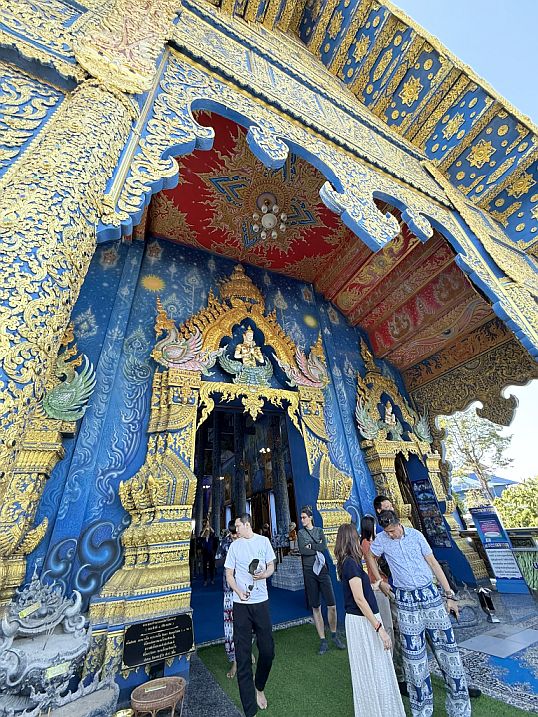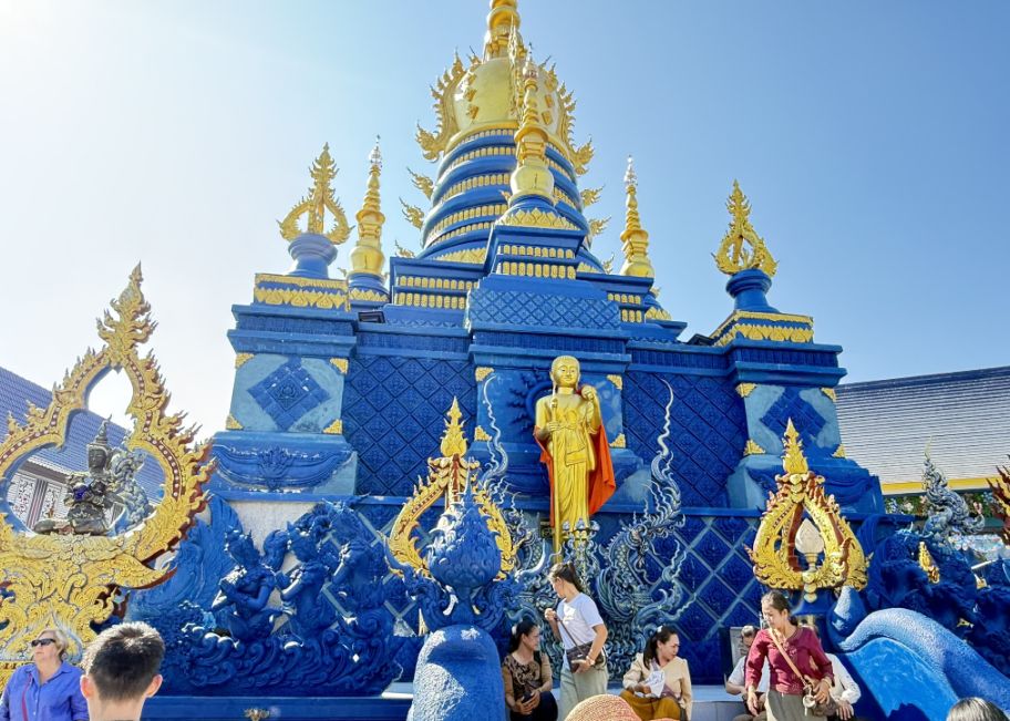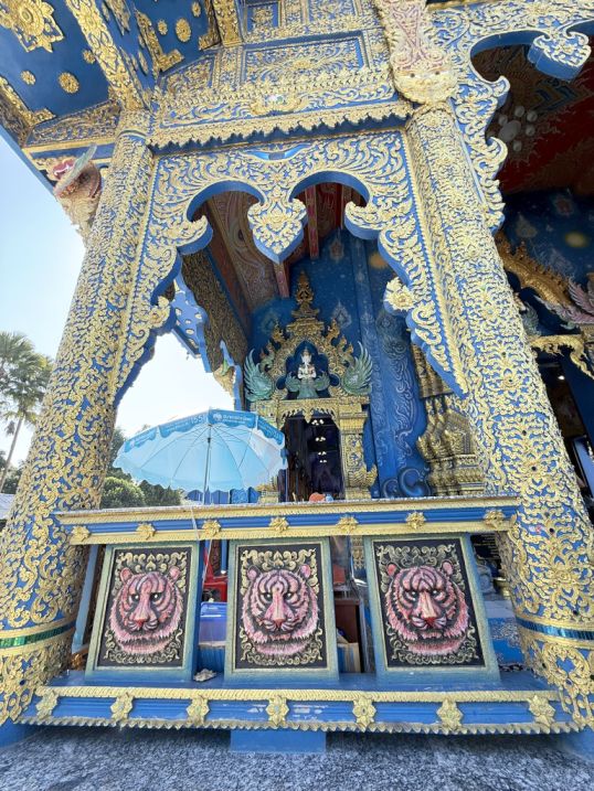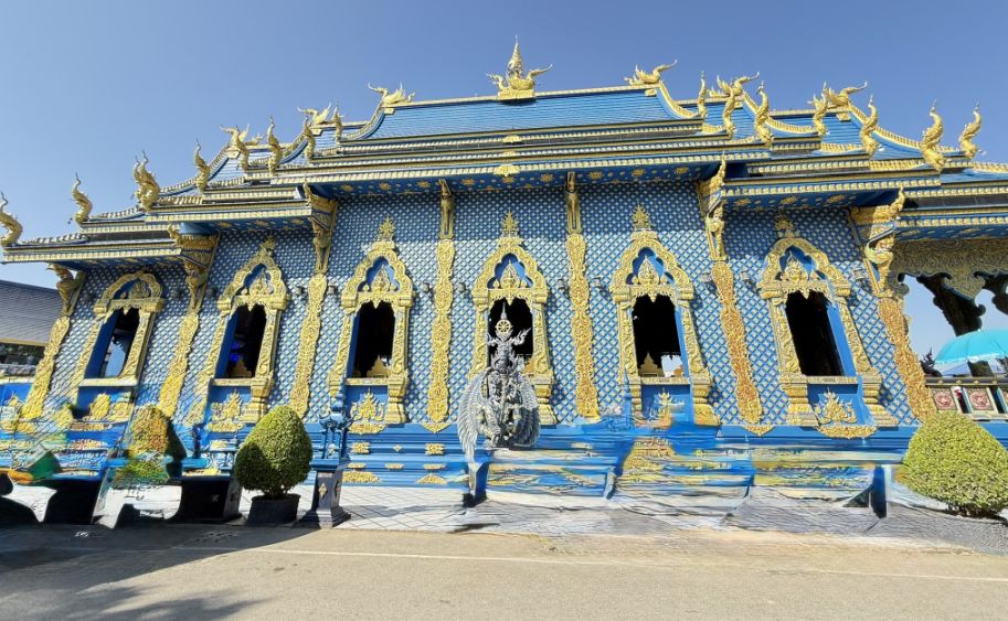 Unlike many ancient Thai temples, this one is relatively new. It was completed in 2016 and designed by local artist Putha Kabkaew, a student of Chalermchai Kositpipat, the visionary behind the White Temple. Interestingly, the site itself has older roots, there was once an abandoned temple here, and the name “Rong Suea Ten” means “House of the Dancing Tiger,” referring to wild tigers that were said to roam this area in the past. The temple’s deep sapphire blue color is what immediately sets it apart. In Thai symbolism, blue represents the Dharma, the teachings of the Buddha, and wisdom, as well as the vastness of the universe. The gold accents layered over the blue create a powerful contrast, symbolizing the material world illuminated by spiritual truth. That’s why at the entrance the golden facade against the rich blue background meant to evoke a sense of entering a sacred, cosmic space.