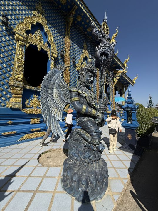Placed along a quieter path, black statue of a winged being, which stands out strongly against the temple’s blue and gold palette. These figures are often inspired by creatures from Buddhist and Hindu mythology. A winged statue could represent a Garuda-like being. The Garuda is a powerful, eagle-like creature associated with strength, protection, and the triumph of good over evil. In Thai culture, Garuda is also a royal symbol, representing authority and divine power. When placed in temple grounds, such figures act as protectors of the sacred space.