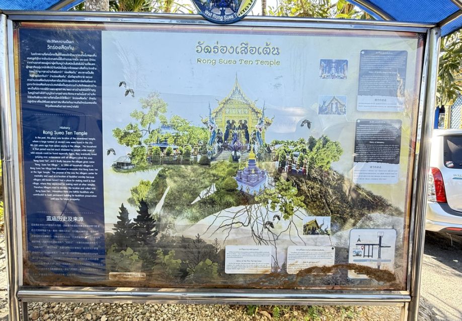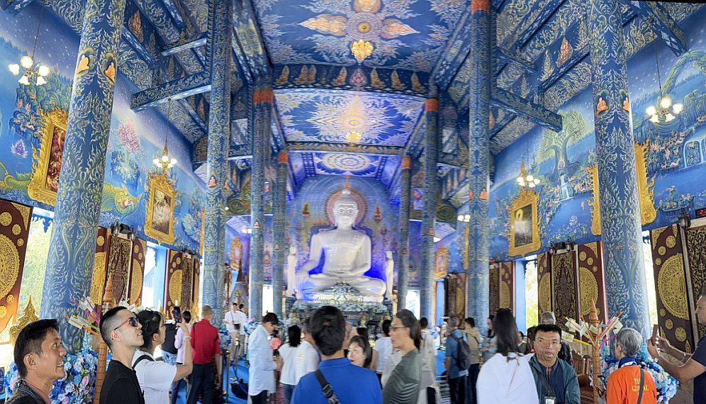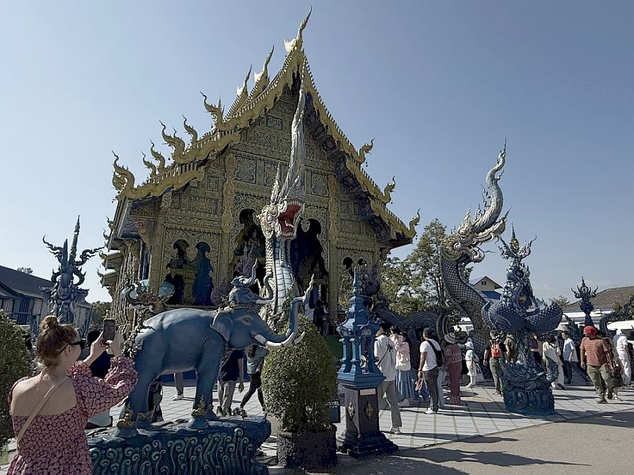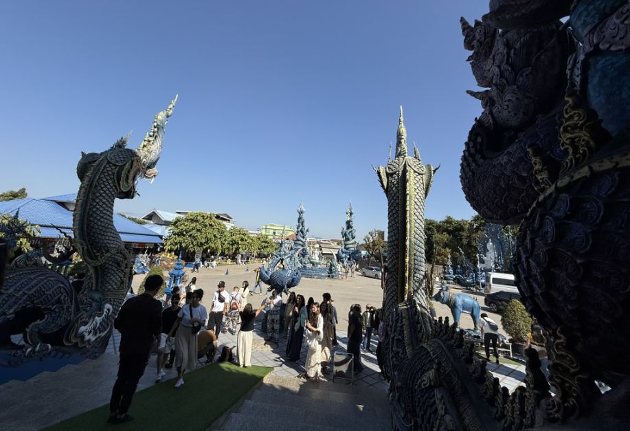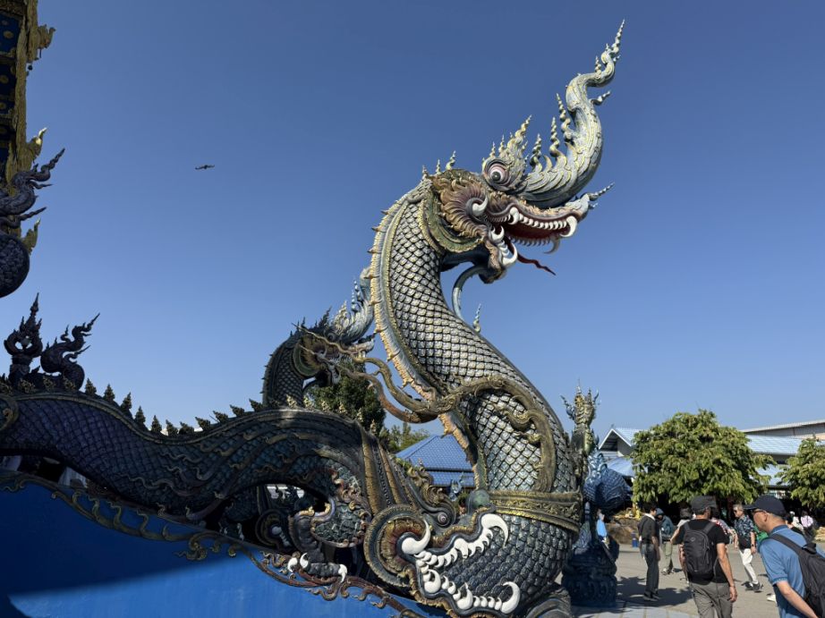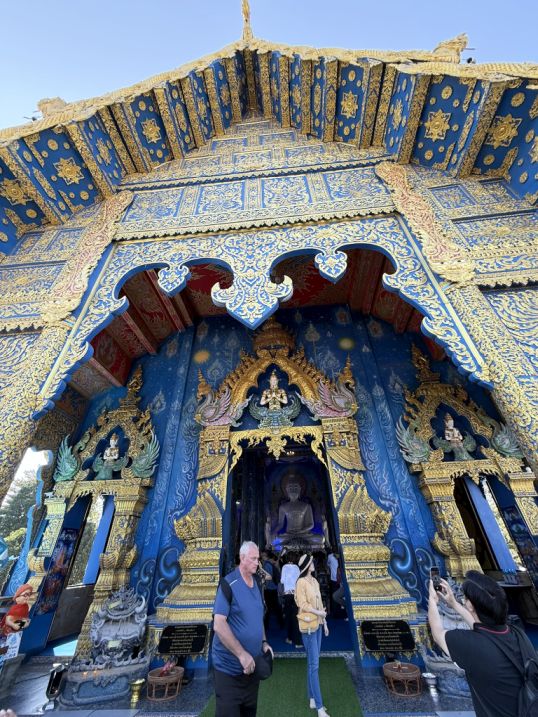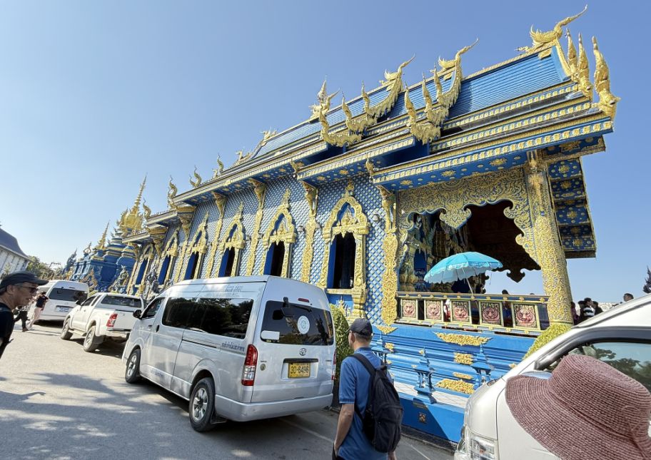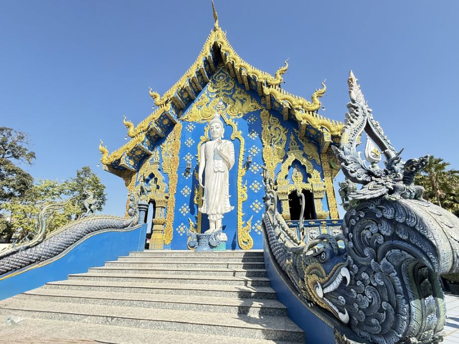 After leaving the White Temple, the short 20-minute drive brought us to one of Chiang Rai’s most striking modern landmarks, Wat Rong Suea Ten, commonly known as the Blue Temple.