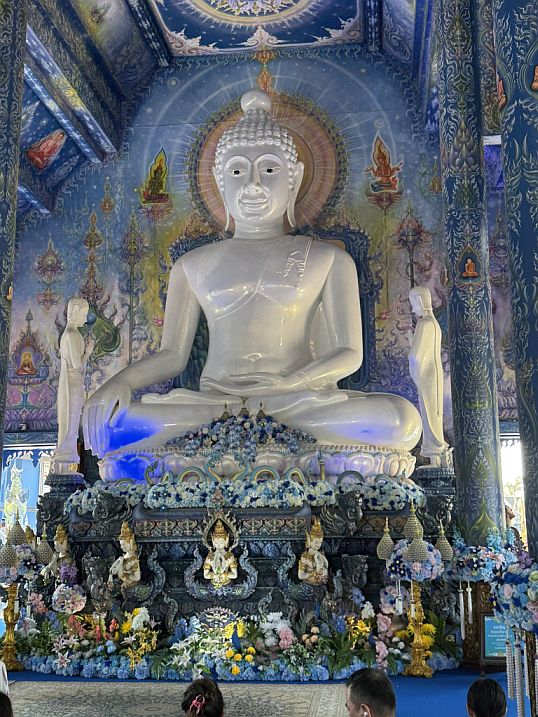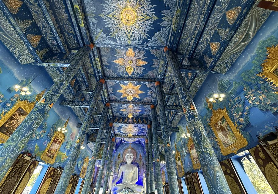 The contrast is striking, the interior is saturated in deep blue tones, with swirling, almost cosmic murals covering the walls, while the Buddha statue is pure white, glowing and serene.