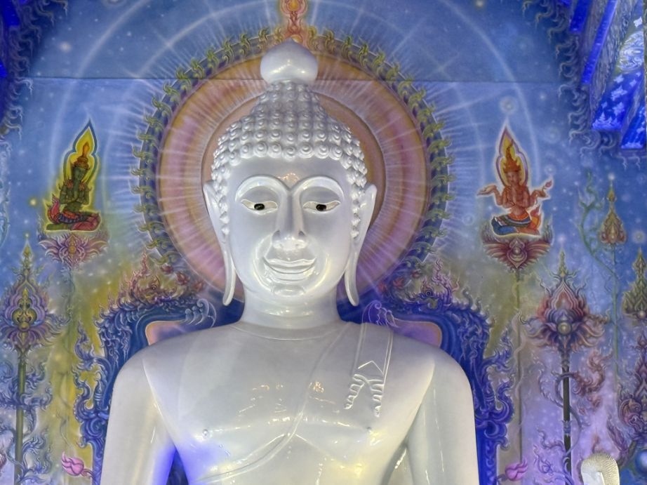 This visual contrast is intentional: the white Buddha represents purity, enlightenment, and ultimate truth, standing calm and still within the vast, complex universe symbolized by the blue surroundings.