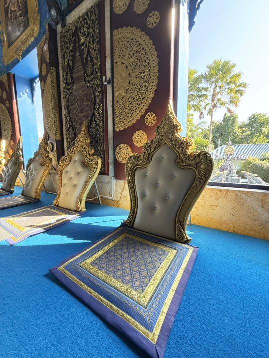 In Thai Buddhist practice, monks hold a highly respected position, and there is a clear hierarchy in how space is used. These reserved seats are typically arranged to face the Buddha directly and are set apart from where lay visitors sit. When monks are present, they sit here during chanting, ceremonies, or teaching.