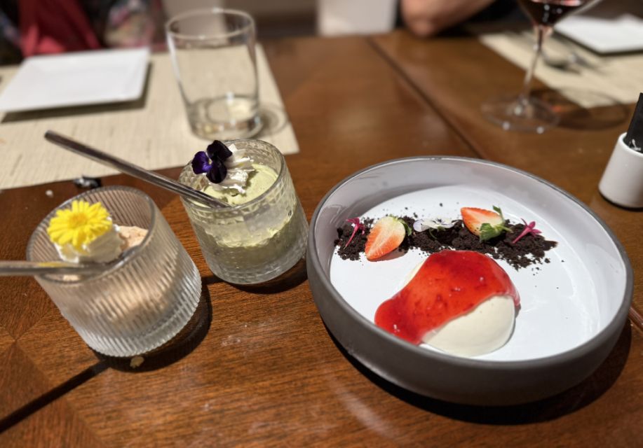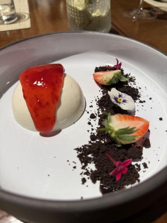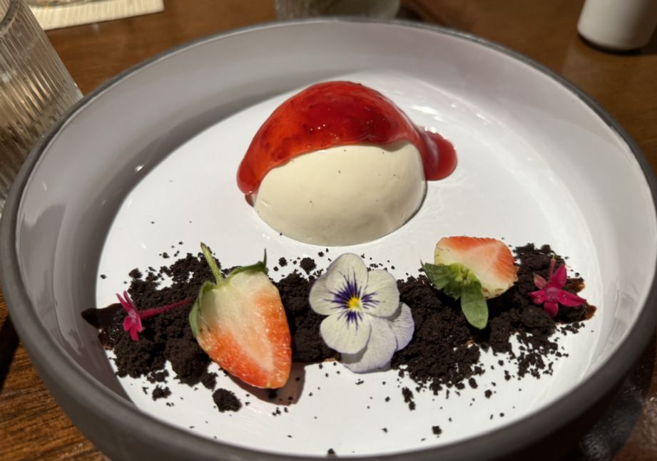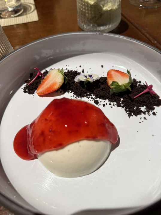 The panna cotta, elegantly presented with strawberry sauce and chocolate crumble, was another success: silky, delicate, and well-balanced between sweetness and texture.